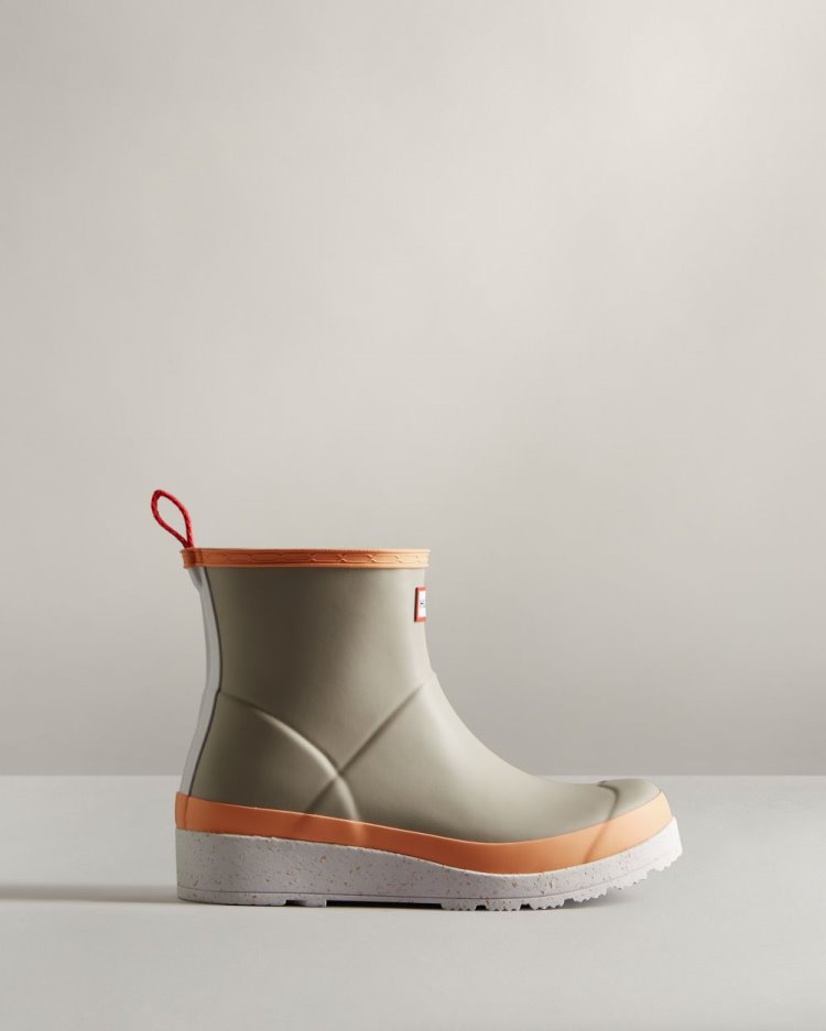 Size/Fit Summary: Slightly larger size, Regular fit. If you are in-between sizes, it is recommended to size down. The iconic design of our Original boot inspired our more minimalist PLAY boot, which has a flat platform sole for maximum comfort. Crafted from the highest quality natural rubber, this women's rain boot is completely waterproof and has been updated with a 100% recycled polyester lining and insole. Just grazing the top of the ankle, this grey and peach boot is fashioned with contrast lines and a unique speckled sole. We recommend that all Hunter Play boots be worn with Hunter Play socks to protect the wearer's skin from contact with rubber.